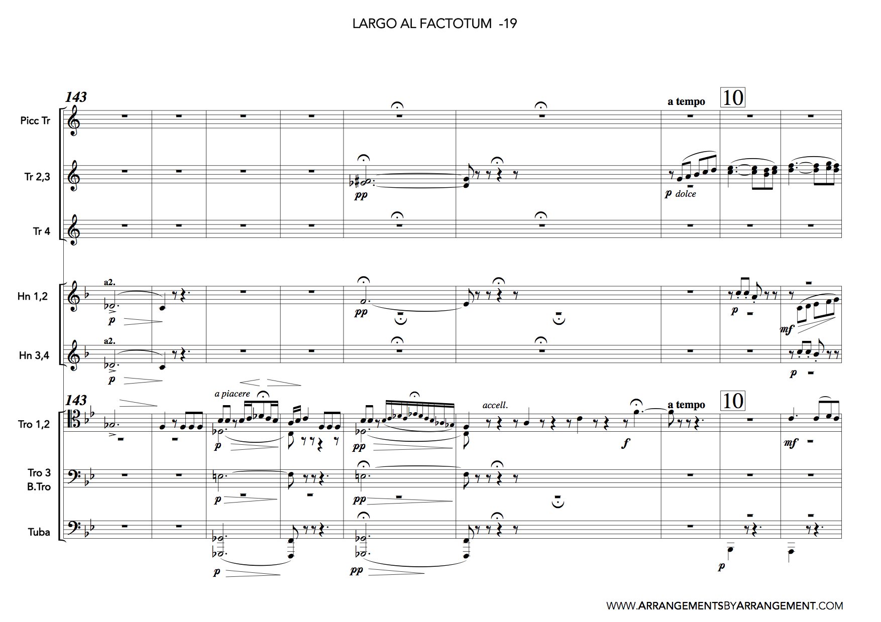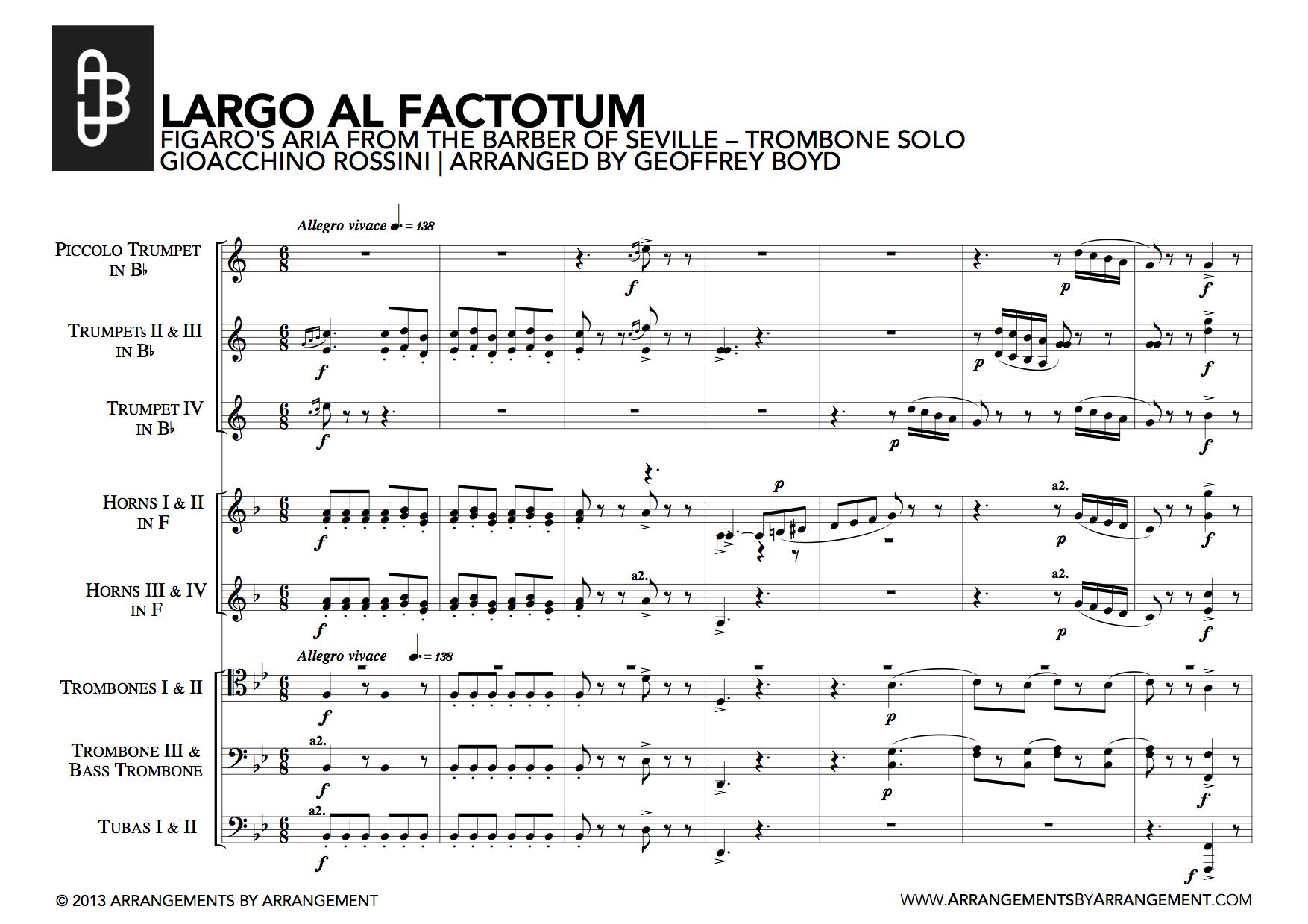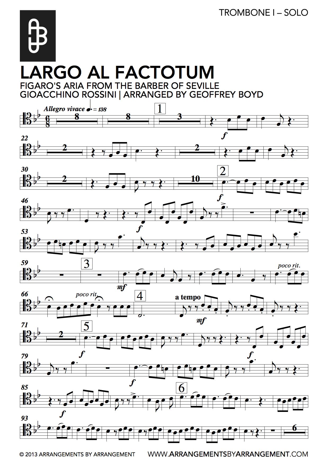 Arrangement of Figaro’s aria ‘Largo al factotum’ from Rossini’s opera The Barber of Seville as a Trombone Solo with large Brass Ensemble